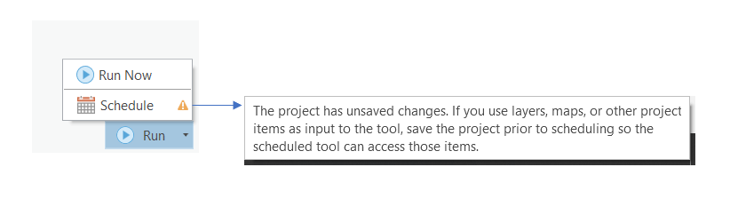 It is quite common for a geoprocessing tool to reference an existing layer from the current project’s Contents pane as the input. In this scenario the project must be first saved before scheduling the tool. Otherwise the tool will fail with an error when the schedule runs. To better guide this user experience, in ArcGIS Pro 2.6 you will get a warning icon next to the Schedule option if the project has not been saved.