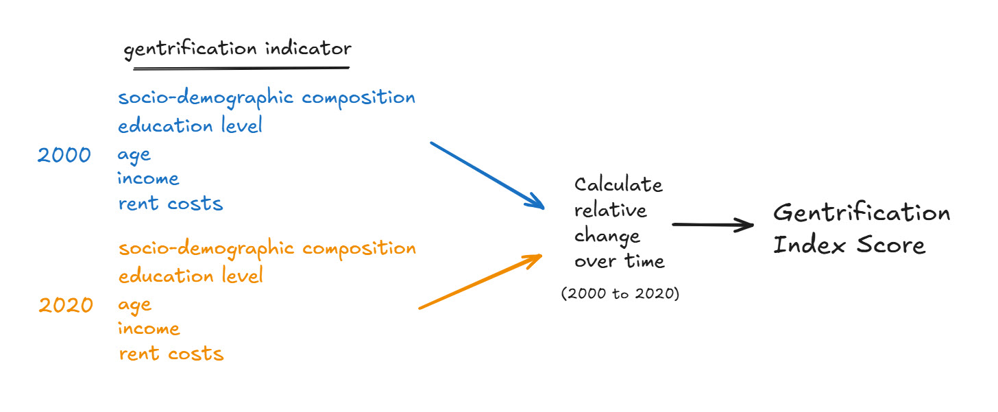 In the paper, the authors collect US census tract data from two different time periods (2000 and 2020) about five gentrification indicators. These indicators were chosen by domain experts based on an extensive review of the gentrification literature.