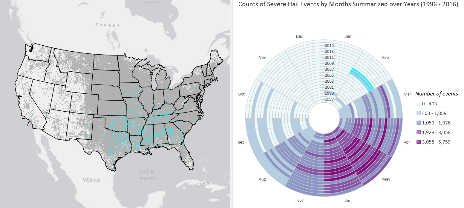 Mark Twain said, “If you don’t like the weather in New England, just wait a few minutes.” Weather is highly dynamic, and a climatology summarizes weather variability over long periods of time. So, we really need to look at hail events from a temporal perspective as well. One way to accomplish this is through visual analytics. To do this we can use a data clock. A data clock summarizes temporal data in two dimensions to reveal seasonal or cyclical patterns and trends over time. The data clock in Figure 3 confirms patterns of severe hail events with very little hail occurring in January and February, increasing occurrence in March and April, to the highest occurrence in the May and June, moderate occurrence in July and August, and finally to a period of very little activity in the fall and winter months.