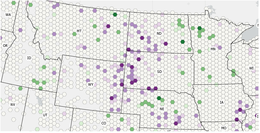 When the cube is created, the temporal trend for each location (county) is captured using the Mann-Kendall statistic. This statistic tells us if there is a significant trend (either up or down) in the number of hail events for each county from 1996 through 2016. Figure 6 shows statistically significant upward trends in the upper Great Plains states of North and South Dakota and eastern Wyoming and significant downward trends in northeastern Oklahoma and other southern states.