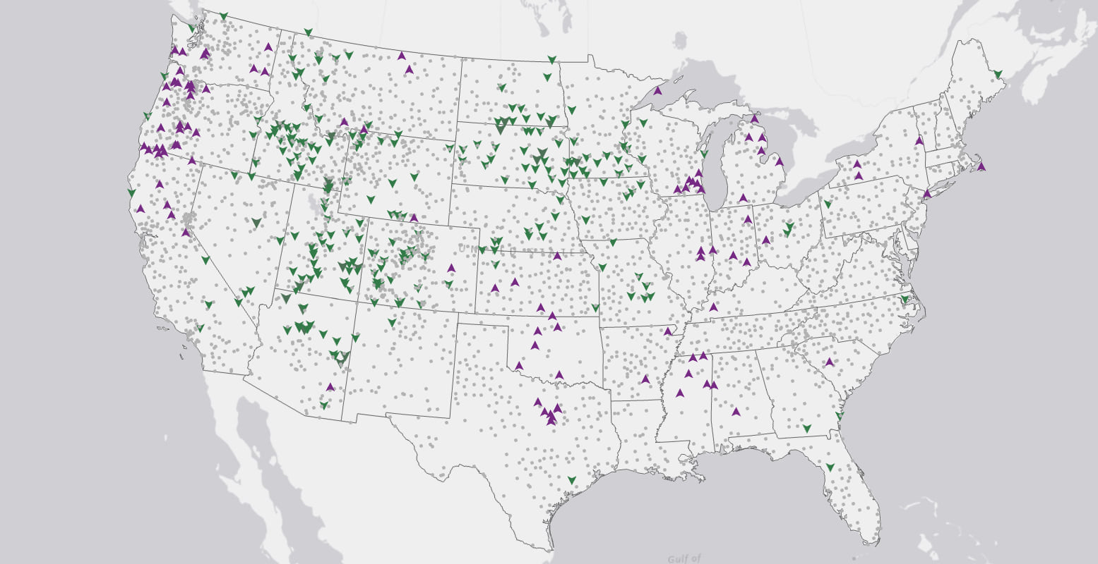 The previous example used modeled climate data to establish a baseline of when to expect the warmest day of the year. However, similar methods can analyze observed meteorological data. For example, the Global Historical Climatology Network (GHCN) archives daily climate summaries across the globe. We can use these datasets to explore whether the warmest day of the year is occurring earlier, later, or not changing. However, meteorological data are inherently messy – instruments malfunction, transcription errors occur, and weather stations are regularly commissioned and decommissioned. As a result, weather data always requires careful validation and cleaning – a task we refer to as data engineering. Using the new Data Engineering capabilities in ArcGIS Pro, I cleaned the tens of millions of GHCN records and identified 3,572 stations in the conterminous U.S. that had consistent observations from 1991 through 2020. Then, using the Create Space Time Cube From Defined Locations tool, I created a space-time cube to explore how the Julian day of the warmest day of the year is changing across time at each station. When the space-time cube is created, a Mann-Kendall trend test is calculated for each station to determine whether the Julian day of the warmest day is occurring later, earlier, or not significantly different. The following map summarizes the trend for each station.