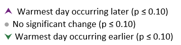 Fascinating patterns emerge. There are two areas, the Pacific NW/Northern California and the central southern states, where we see statistical evidence (p ≤ 0.10) that the warmest day is occurring later in the year. The majority of the stations in the Pacific NW are in a historically temperate, dry, and warm summer climate regime (Koppen-Geiger Csb classification based on visual comparison to updated maps produced by Beck et al. 2018). The stations in the southwest are in a temperate, no dry season, hot summer climate regime (Beck 2018 category Cfa). Global increases in temperature and the resulting increases in summer storms likely delay the onset of warm summer temperatures in these areas.