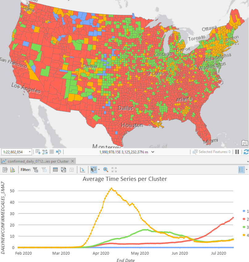 We can also go one step further and run the Time Series Clustering tool to discover the various types of stages for all the US counties: many counties (in red) still see surging cases like Ventura County, CA. Some counties (in yellow and green) have already flattened the curve after hitting a plateau at various time periods, like New York City and Cook County, IL where Chicago locates. Some counties (in blue) has never seen any confirmed cases yet.