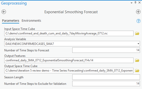 First, let’s try Exponential Smoothing Forecast. In the tool’s UI, we point to the space-time cube we created in the previous article (or can be downloaded here) as Input Space Time Cube, use DAILYNEWCONFIRMEDCASES_SMA7 as Analysis Variable, and choose 14 days as Number of Time Steps to Forecast, which gives us a 2-week forecast. The parameters above will be shared across the three forecast tools, and there is an optional parameter called Season Length that is unique to the Exponential Smoothing Forecast tool. For Season Length, We can: