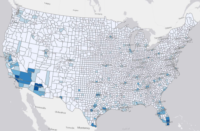 We can examine the results using the diagnostics and Output Features. The Output Features are symbolized with the forecasted value of the last forecasted time step, and this is the case for all the four tools in the toolset. With the darker shade of blue showing higher forecasted, we can forecast the most daily new cases will be shown in California, Arizona, Texas, and Florida. Counties taking a conservative approach in reopen plan, like New York and Chicago, are in a lighter shade of blue, meaning that reopening slowly do work well in controlling a potential second wave of COVID-19.