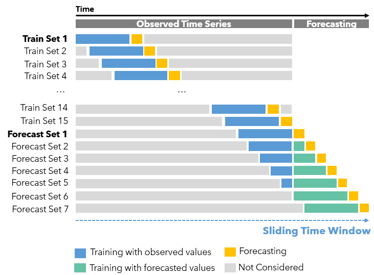We can also use the Forest-based Forecast tool to deal with complex time-series data. If you’re already familiar with our Forest-based Classification and Regression tool, think of the original explanatory variables as the previous time steps here. How many previous time steps will be used is defined by the Time Step Window parameter. As shown in Fig.7, this tool uses this Time Step Window as the length of a sliding time window, which contains all the explanatory variables (in blue) to forecast the next step (in yellow), and as the window moves or sliding to the right, we can get all the Training Sets. And once the sliding time window moves to the end of the observed time-series, the Forecast Sets start. Assuming the Time Step Window is set to 14, in Forecast Set 1, we will use the last 14 observed data to make the first forecast (in yellow). Then in Forecast Set 2, we use the last 13 observed data (in blue) and the first forecast data (in green) to make the second forecast (in yellow). So on so forth.