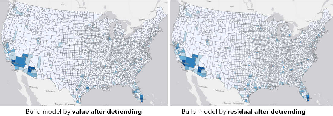 Although the auto-detected window size is the season length for seasonal data, it doesn’t mean you can’t use other window sizes to get ideal results. If the detected season is short, say 5, you could also use any larger window size to model the seasonality in your data. Especially when your data is experiencing some recent trend changes, you may want to use a larger window to let your model consider not only recent changes but also longer-term overall patterns. For example, for the COVID-19 data, we might try some larger window sizes like 28 days due to the dramatic emergence of daily new cases in the recent one or two weeks for some counties. If the detected season is very long, say 365 for a yearly pattern, we should expect the tool to take several hours to run a forest-based model with 365 explanatory variables. If this is the case, here are several suggestions to increase the speed: