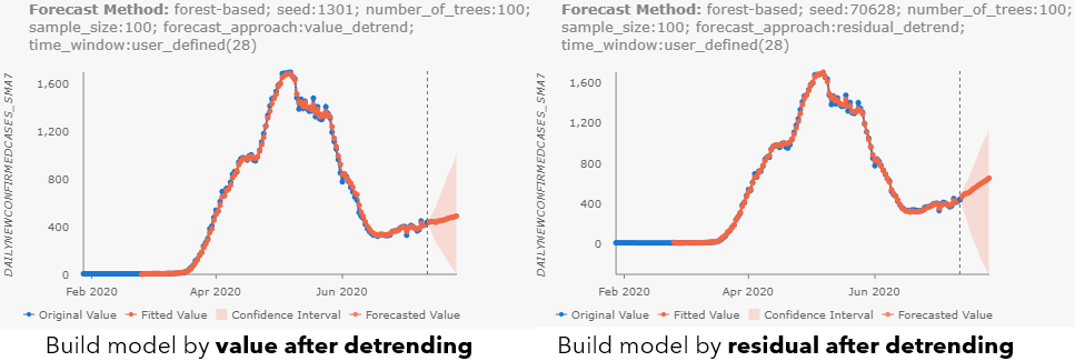 Basically, if your data has some overall trend and you want to carry the overall trend to the future, not to choose the building model by value because it cannot do extrapolation. Instead, you can start with the two approaches with detrending. The option building model by value after detrending considers mostly whether the trend is increasing or decreasing overall. The option building model by residual after detrending considers whether the rate of increasing or decreasing is changing recently compared to previous data, and assumes the recent change in the increasing or decreasing rate will continue to the future, so visually this method can give a more dramatic result than the previous option. When checking the output features of the two approaches (see Fig 9), we can see the overall patterns are quite similar.