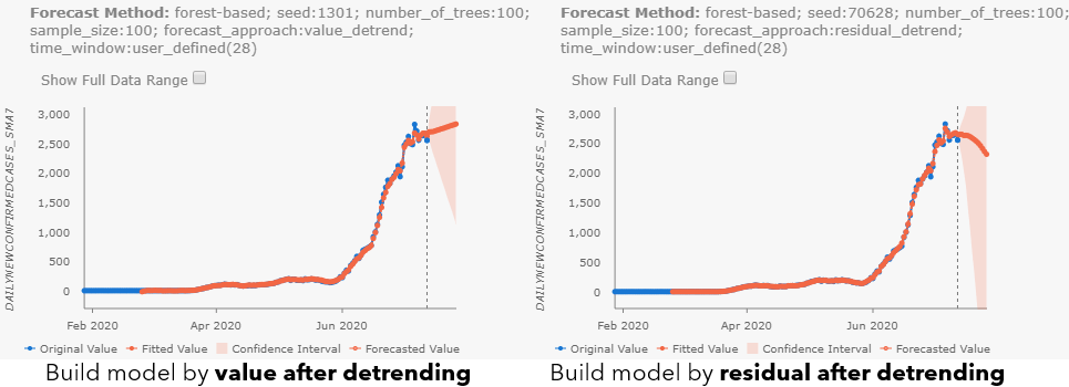 By checking the pop-ups at Maricopa County, AZ (see Fig 10.a), and Cook County, IL (see Fig 10.b), we can notice the different results with different forecast approaches. Besides, as you may have noticed, all parameter choices for Forecast Approach, Time Step Window, and parameters in Advanced Forest Options are also included in the Forecast Method field. When the confidence interval is large, you can also check the Show Full Data Range checkbox above the chart to see the entire confidence interval.