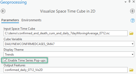 Plotting out the time-series data and learning about the patterns in your data is always recommended as the first step before you start building forecast models. Since ArcGIS Pro 2.5, new pop-up charts have been built into the Output Features generated by the Visualize Space Time Cube in 2D tool. We can start exploring the data by running this tool by checking the Enable Time Series Pop-ups parameter, see Fig 1. If you skipped part 1 of the series, you can find a sample space-time cube to run inside the ZIP file.