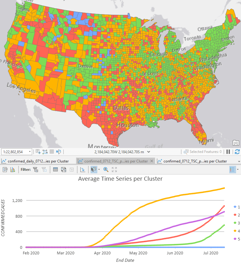 We have gone through the data preparation with ArcGIS Notebooks in ArcGIS Pro in part 1 and forecasted daily new confirmed cases in part 2 of this series. This third blog article is the final part to show how we can forecast cumulative confirmed cases of COVID-19 at the US county level with the Time Series Forecasting toolset. Check out the demo below from the UC 2020 plenary to get a quick overview of these forecasts and analysis, if you haven’t got a chance.