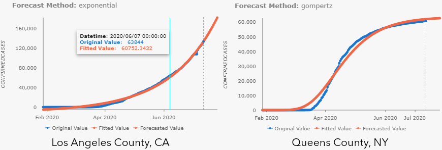 Pop-up charts are also automatically generated in the Output Features. The only difference for Curve Fit Forecast is that there are no confidence intervals for this method. As shown in Fig 5, exponential curve is chosen for the cumulative confirmed cases in Los Angeles County, CA, meanwhile, S-shaped (Gompertz) curve is chosen for that in Queens County, NY.