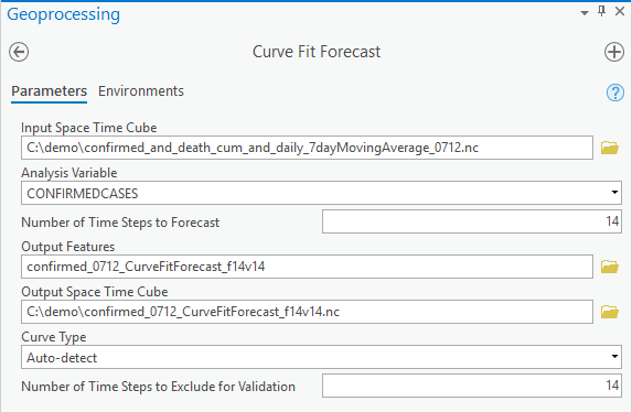 The choice of curve type is based on validation with the last 14 days, as we set the Number of Time Steps to Exclude for Validation to 14. After you hit the run button, internally, for each location, the tool first fits a linear curve with all the time steps except for the last 14 time steps, then calculates a Validation RMSE for the last 14 time steps. We call this a Validation run. Then the tool fits a new linear curve with all the time steps and computes the forecast. We call this a Forecast run. Secondly, the tool does a validation run to fit a parabolic curve and compares its validation RMSE to the linear curve validation RMSE. If the new validation RMSE is smaller, then the parabolic curve has a better fit, so the forecast is computed using the parabolic curve. On the contrary, if the new validation RMSE is larger, the forecast won’t be run for the parabolic curve and the tool will move on to the next curve type, which is an exponential curve. The same process is repeated for the exponential curve and S-shaped (Gompertz) curve, resulting in a forecast using the curve with the lowest validation RMSE. The default is to use the last 10% data as validation, and the upper limit is 25% of the total time steps. To get the ideal choice of the curves, we suggest using 20%-25% if possible as validation. Now you understand all the parameters, you can try out the tool!!