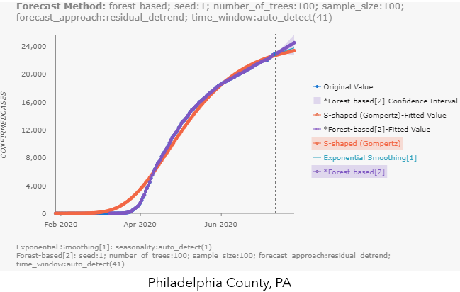 The highlights of the visualization outputs for this tool are the pop-up charts, which contain ALL the alternative forecasts from each of the input cubes! This makes it extremely easy for us to compare the different forecast methods. You can hover over the chart to check the forecasted values and confidence interval (if applicable) for each method, like shown in Fig 9.a for King County, WA. You can also click the label names to the right of the chart, to make the unselected method appear, like the S-shaped (Gompertz) forecast in Philadelphia County’s pop-up chart in Fig 9.b.