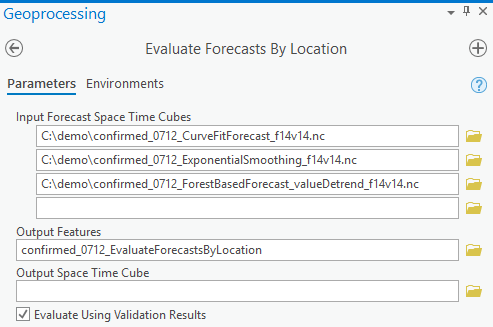 One of the things we really love about this toolset is that it can evaluate which model and which curve type that we’ve used works the best location by location. Just remember to generate the output forecast cube every time you run the forecast tools and use them as input cubes in the Evaluate Forecasts by Locations tool. It can choose the best method either based on Forecast RMSE, which is a measure of overall fitness of model in the forecast run or based on the Validation RMSE, which is the measure of forecasting power of the model in the validation run, by checking the checkbox for Evaluate Using Validation Result. It’s recommended to start with using Validation RMSE since it’s checking if the forecast model from a shorter dataset has good forecast power. See Fig 7 for parameter setting in the tool.