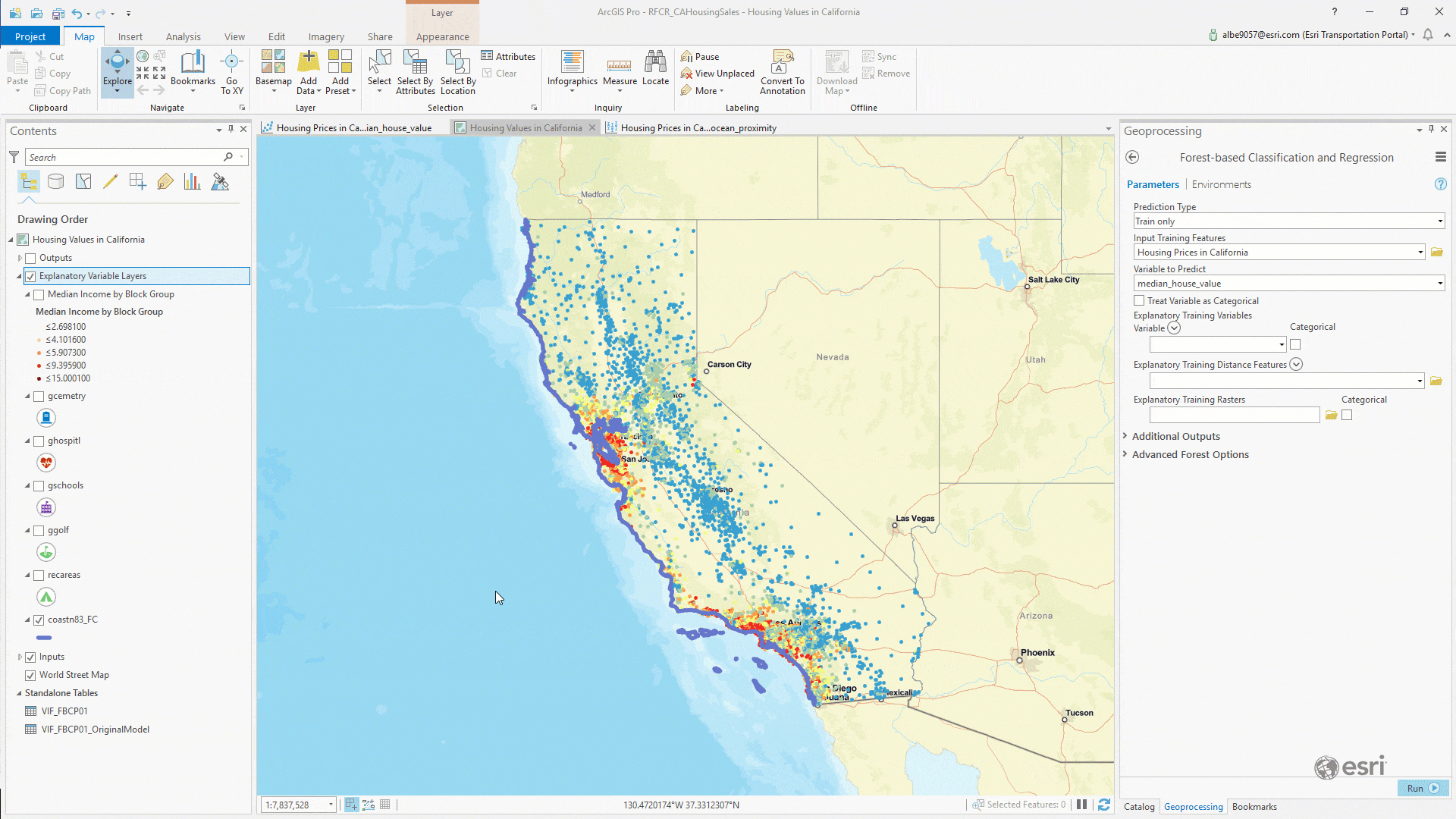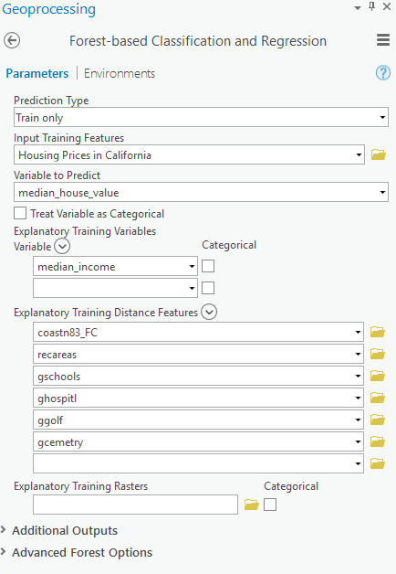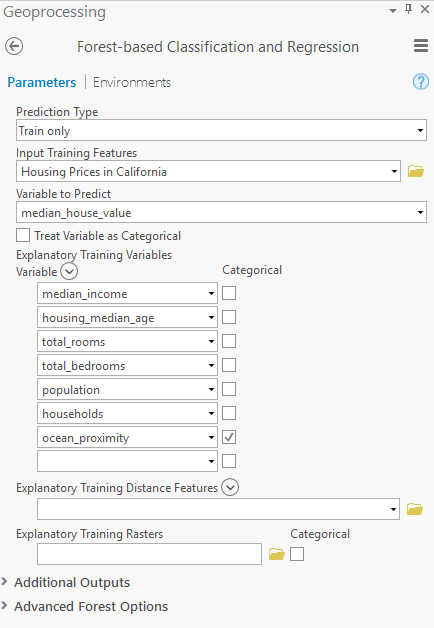 We will specify the input training features, passing our GIS layer of tracts in California, our variable to predict, using the “median_house_value” attribute, and then specify which attributes will be used for the model in the “Explanatory Training Variables” parameter section by selecting each corresponding column in your input data. When complete, your geoprocessing tool inputs should look like this: