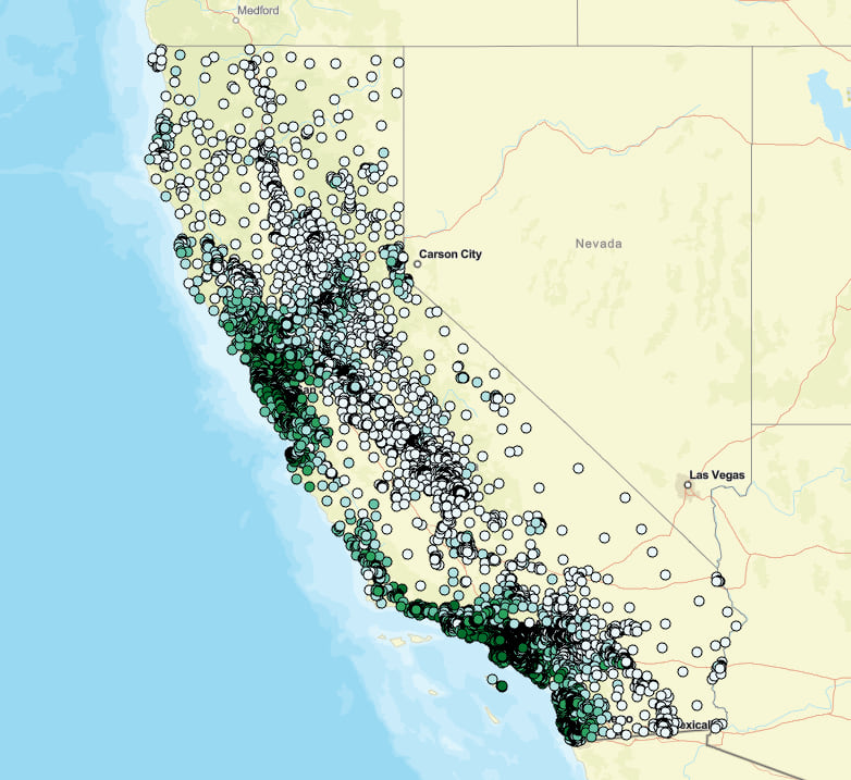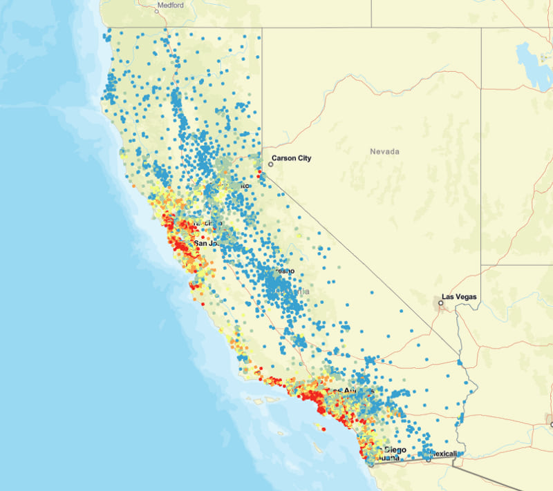 In this map, each point signifies the centroid of a tract in California. The color range represents the average home sale value of all homes in the tract. Blue represents low sales values, yellow represents medium sales value, and red represents the highest values.