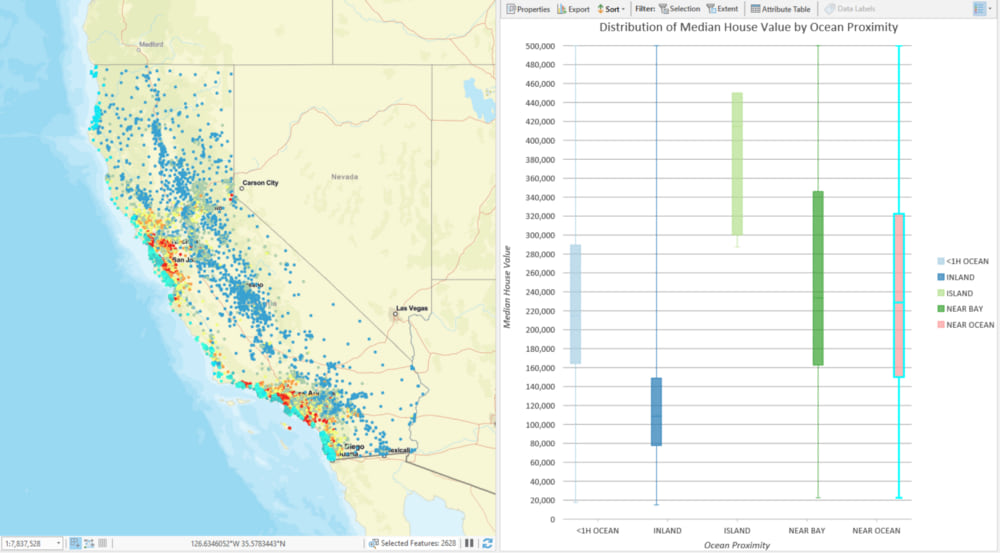 You may notice that higher-priced homes are situated near the largest metropolitan areas. You may also notice that higher-priced homes are situated near the coastline. A quick exploratory chart in ArcGIS Pro helps us explore these patterns: