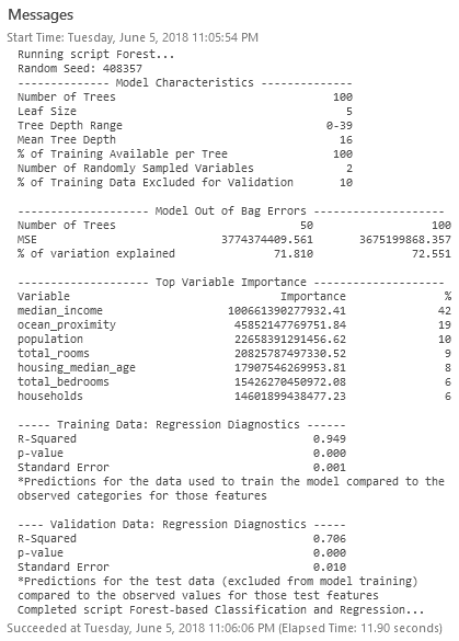 The assessment of top variable importance provides a general sense of which factors helped the model (median income and ocean proximity mattered a great deal). For now, let’s make note of our R-Squared value: 0.706 (this may differ slightly when you execute).