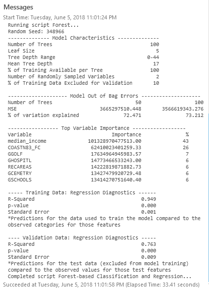 Once you execute the model, the tool builds a forest that establishes a relationship between explanatory variables and the designated variable to predict. For more information on how this tool works, please be sure to read this.