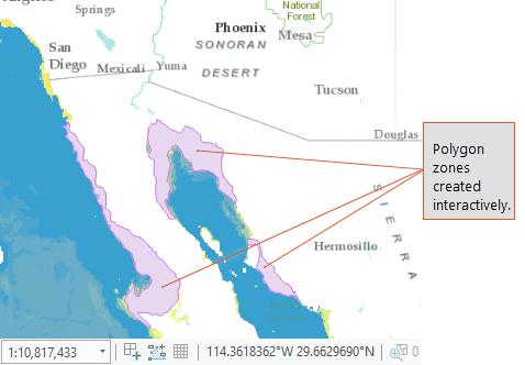 Now start drawing the features. For this example, I am comparing Seafloor Dissolved Oxygen (ml/l) at the coastline on both sides of the Gulf of California, and I have chosen the free shape polygon to digitize the zones.
