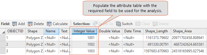 For Zonal Statistics as Table, we need an attribute to uniquely identify each zone. Open the attribute table of the zone polygon layer you just created. You will notice that it already comes with some default fields of different types. We are going to use the ‘Integer Value’ field for the analysis, so will enter a value for each of the polygons, and then save the table.