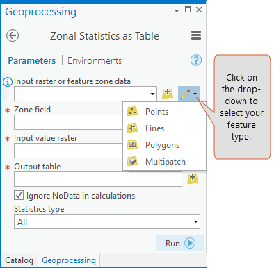 - Select the appropriate feature type (points, lines, polygons) from the interactive feature drop-down menu that is supported by the tool parameter. Multipatch is not supported by any of the Spatial Analyst tools, so the tool would fail if it is selected.
