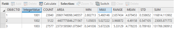 In the tool, use the ‘Integer Value’ field as the Zone field. Populate the rest of the parameters, specify the output and run with the ‘All’ Statistics type. The output table should appear something like below.