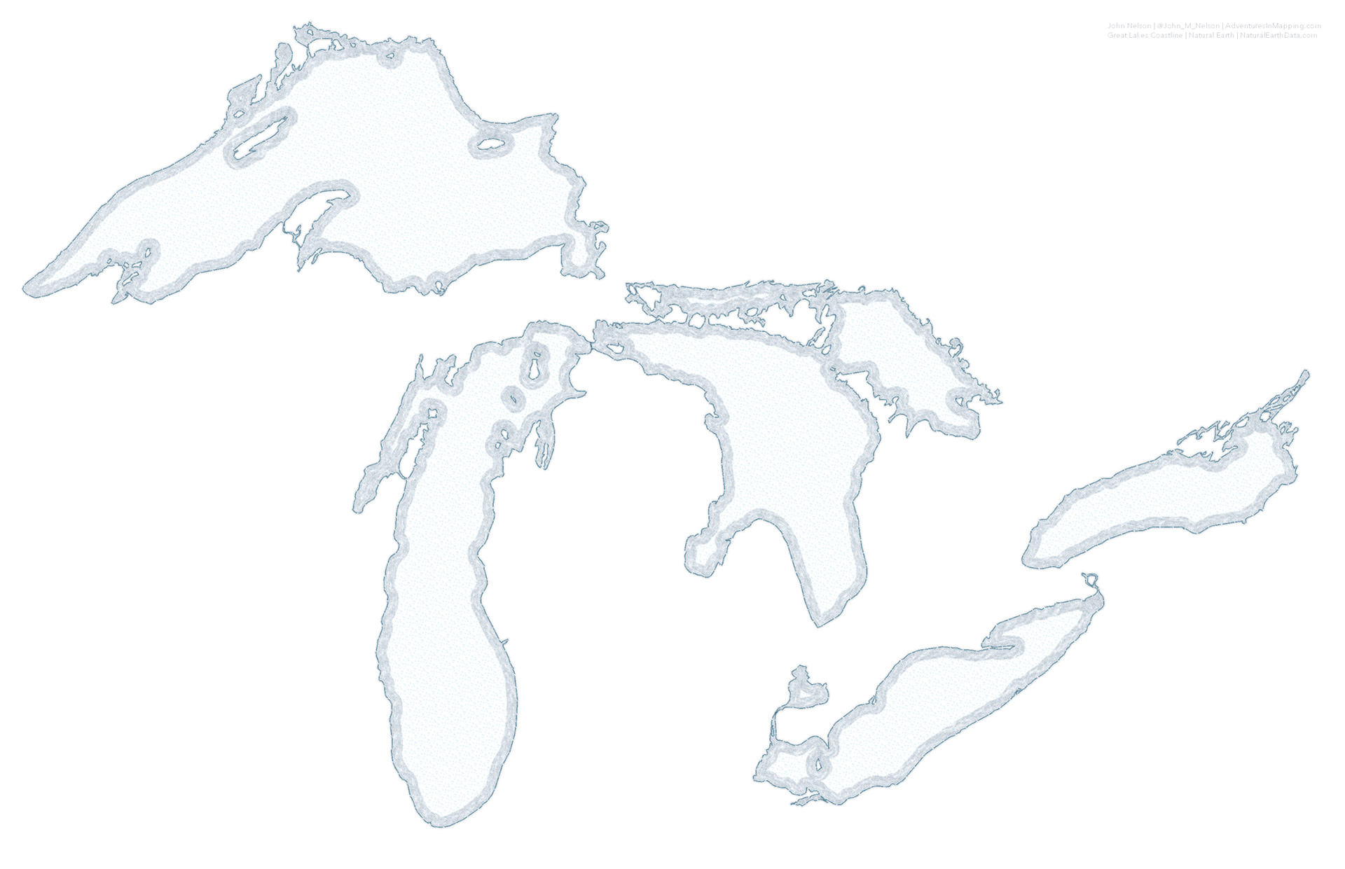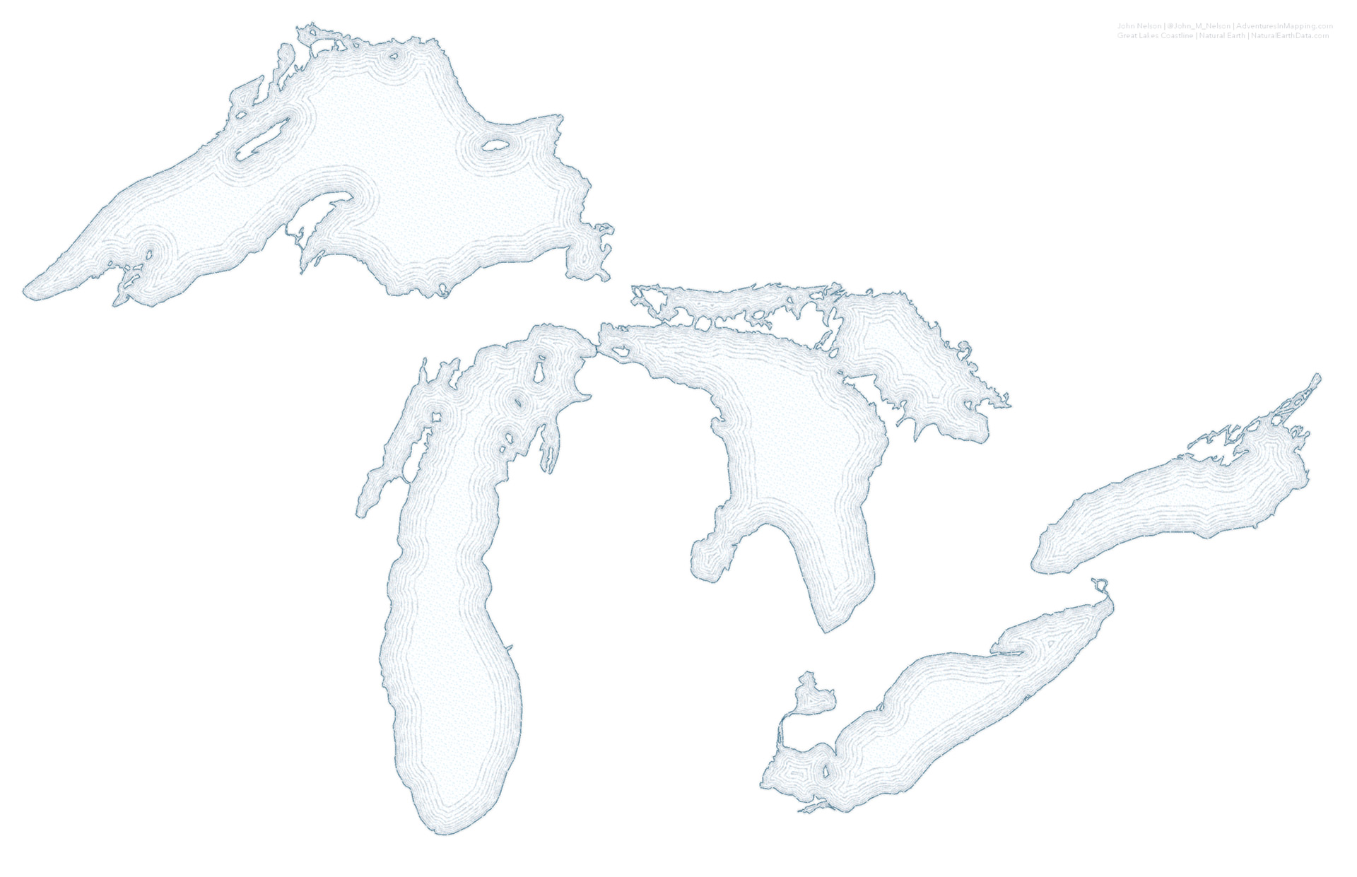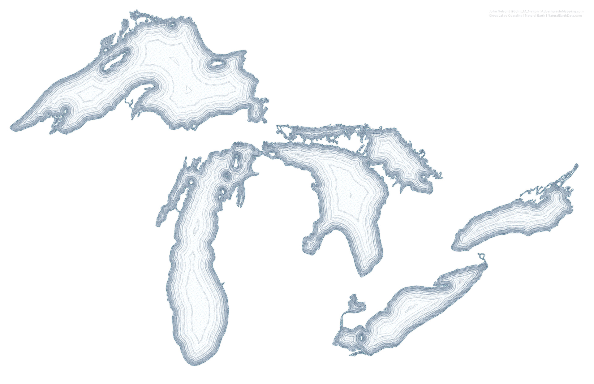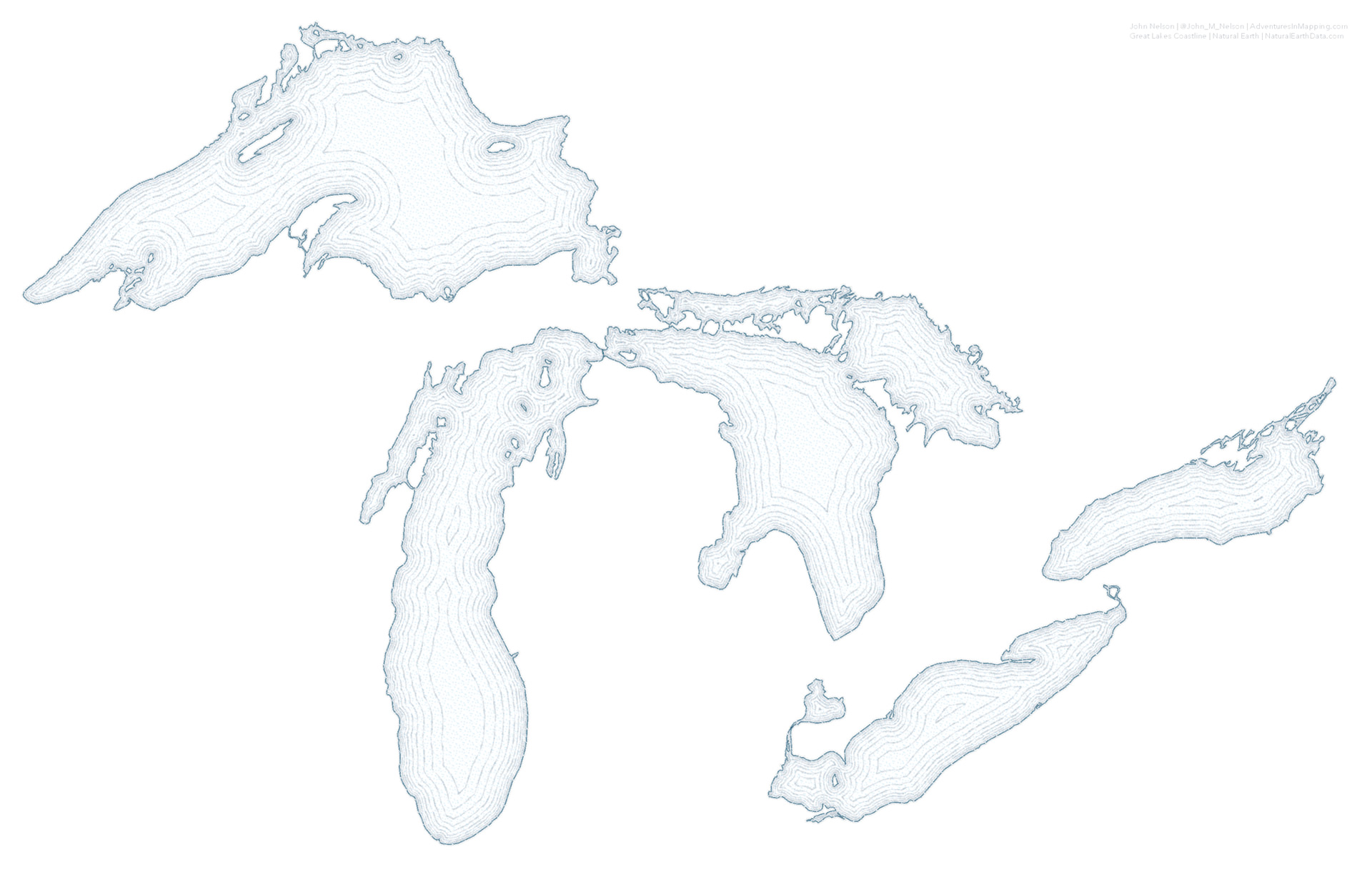 So let’s think about that rate of water line spacing. If the spacing were the same for each water line ring, that would give it a spacing of 100%. If the distance doubled with every ring, that would be a spacing of 200%. How much or little the spacing changes is wholly up to you, the cartographer. Daniel Huffman, a mighty-thoughtful cartographer, has written a paper in Cartographic Perspectives on this. If you have a couple minutes, it’s welllll worth the read.
