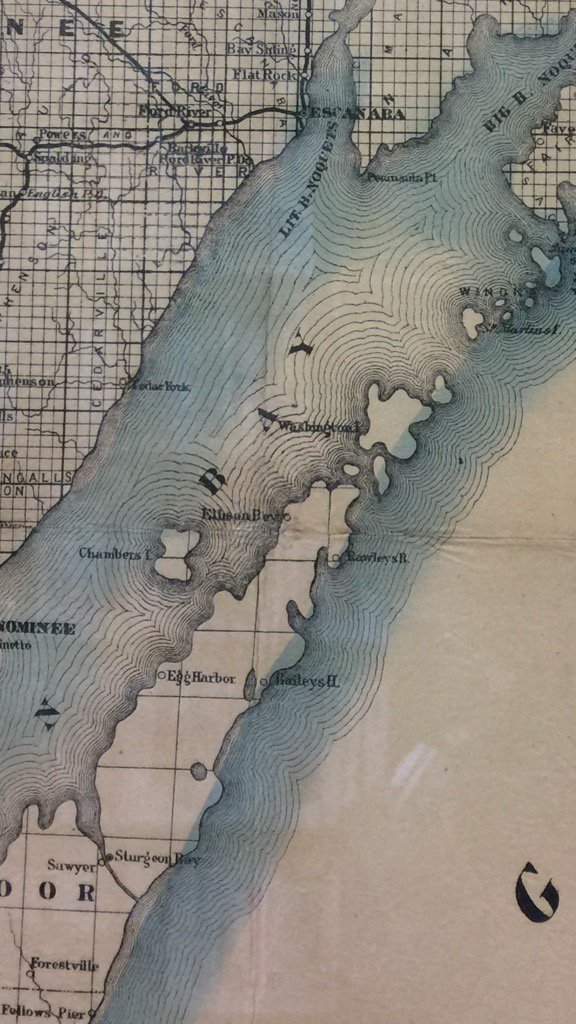 Here’s an other example I saw hanging on the wall of the Petoskey, Mi, library. It’s a Cram’s sectional map from 1883. These water lines are also iteratively increased in their separation. This spacing rate is more than the map, above. Pay no mind to the alarmingly hastily applied watercolor tinting.