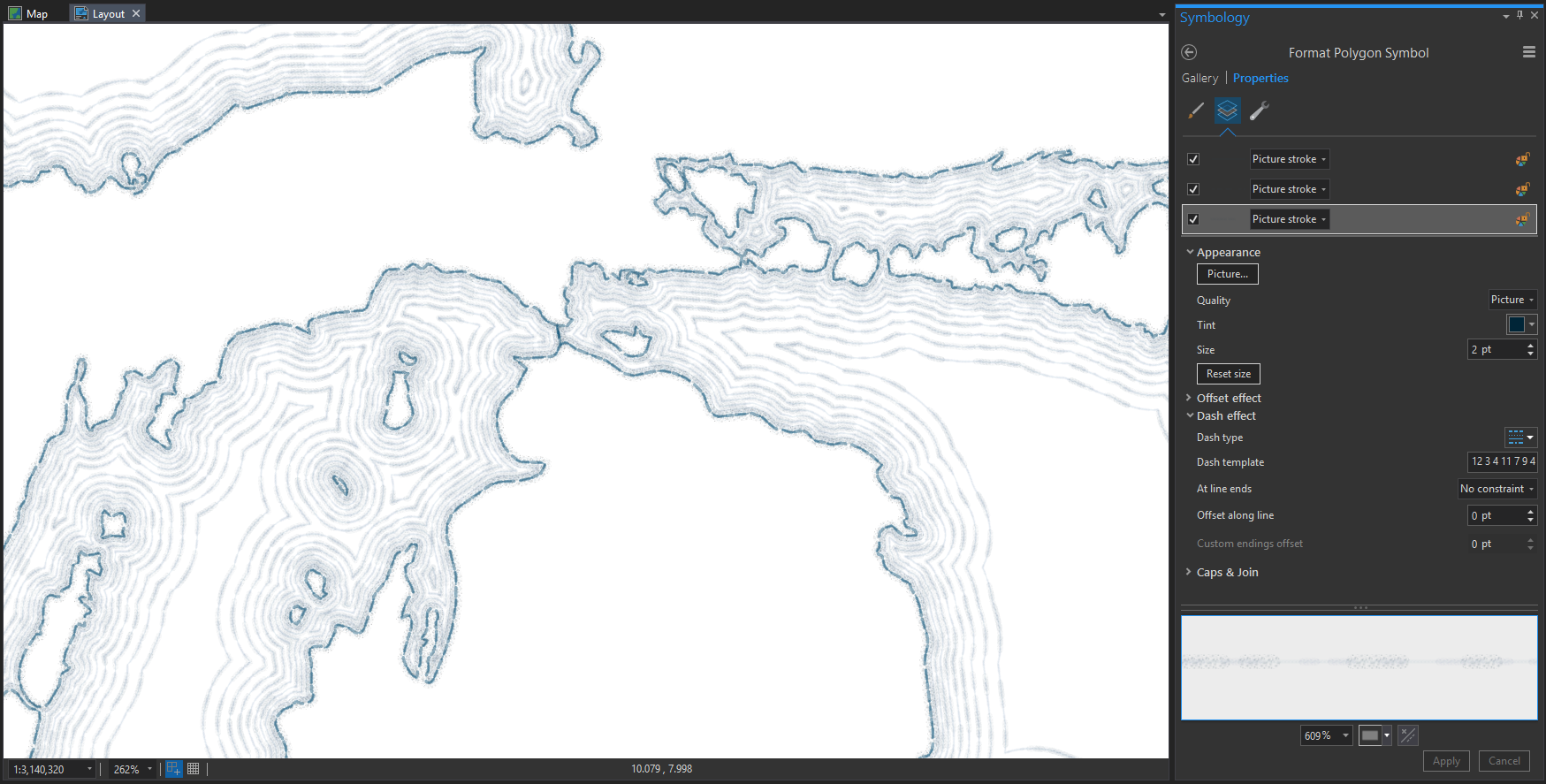 Water lines could be a really interesting way for you to bestow a beautiful crafted quality to your maps. And it’s a pretty straightforward process in Arc GIS Pro, using the Multiple Ring Buffer tool.