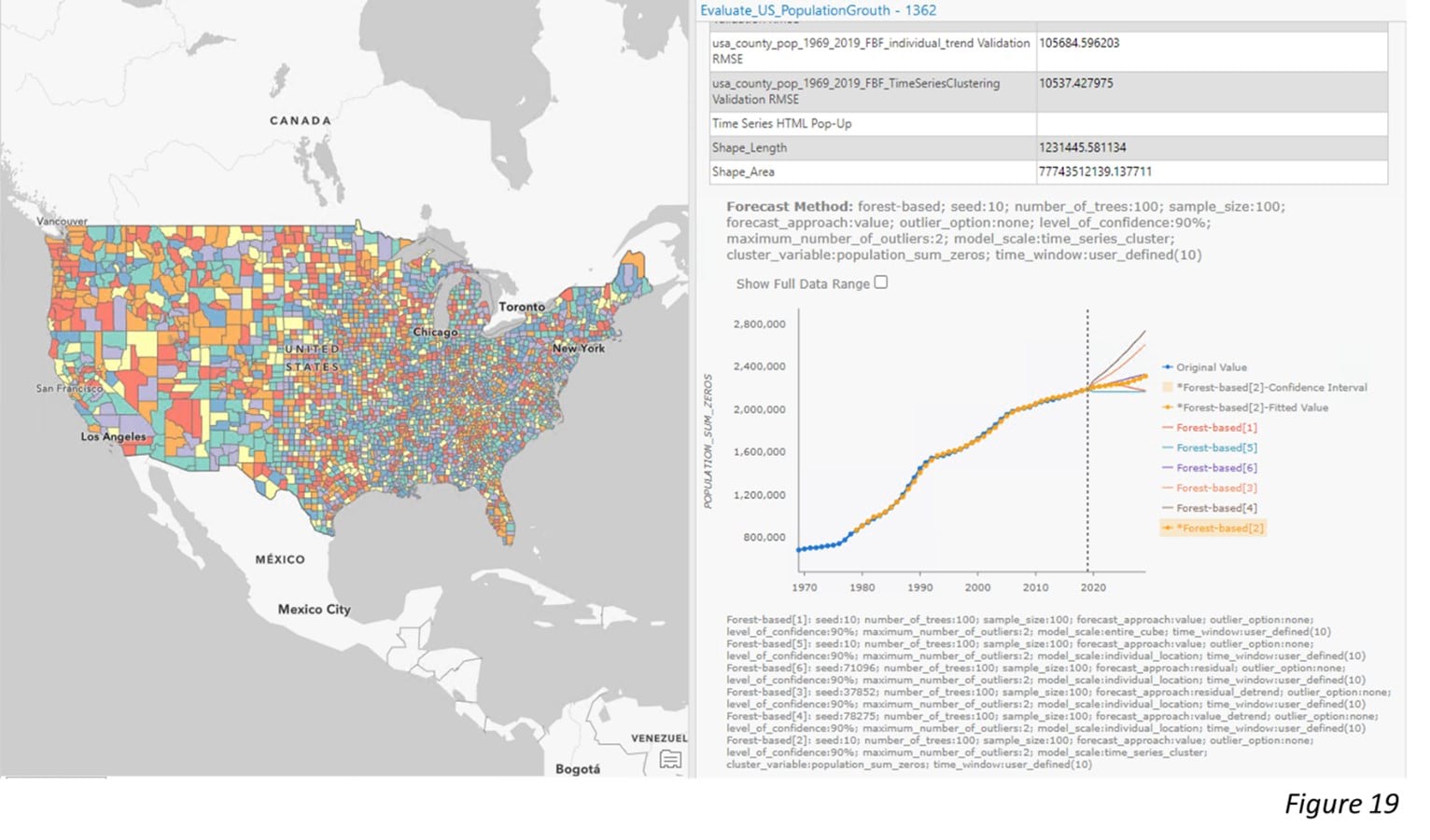 The time series forecasting technique helps us understand the past and predict the future. Time Series Forecasting toolset including Curve Fit Forecast, Exponential Smoothing Forecast, and Forest-based Forecast has been released in ArcGIS Pro 2.6. Since then, we have gradually enhanced the Forest-based Forecast tool with new functionalities in ArcGIS Pro 2.9 and 3.0 to respond to users’ requests. This article includes two parts. The first part introduces the recent enhancements we added to the Forest-based Forecast tool. The second part demonstrates how to integrate the Forest-based Forecast tool into your analysis workflow using an ArcGIS notebook.