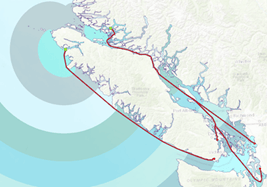 Figure 5 – Comparison of planar (blue) and surface distance (gray gradient) buffers around Lake Wakatipu in the Queenstown area of New Zealand. Both buffers extend to a distance of 1500m, but the gray gradient output measures distance over the surface of a DEM instead of distance in the plane of the data’s projected coordinate system. - Using the new Optimal Path as Raster tool, you can count how many least cost paths pass through a cell en route from some destinations to a source.
