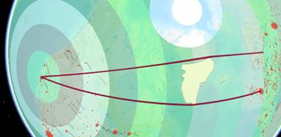 Figure 4- Geodesic flight paths from some Northern European airports to LAX, but avoiding paths over southern Greenland. - As a side effect of the improved algorithm, you can now create buffer regions whose distance is measured over the surface of a digital elevation model. This isn’t really a separate capability, but it’s important enough to mention explicitly. In the example below, the study area is Lake Wakatipu near Queenstown, New Zealand – a high relief area. Notice how, in such areas, the output of the Distance Accumulation tool (gray gradient) with a maximum accumulation cutoff of 1500m “pulls away” from the output of the vector Buffer tool that used a buffer distance of 1500m. This surface-aware distance computation can be done in either planar or geodesic mode.