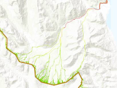 Figure 6 – Optimal Path As Raster output from ridgeline hiking trail in SW to access road in NE. Green is less intense usage, red is more intense. - Using the new source_location output from Distance Accumulation and Distance Allocation, you can do intensity mapping of the boundary of sources, showing where most cost paths in the study area would end up, without plotting all cost paths. The RasterCellIterator python object, also new at ArcGIS Pro 2.5, makes this type of intensity calculation very easy to perform. See A quick tour of using Raster Cell Iterator to know more about it.