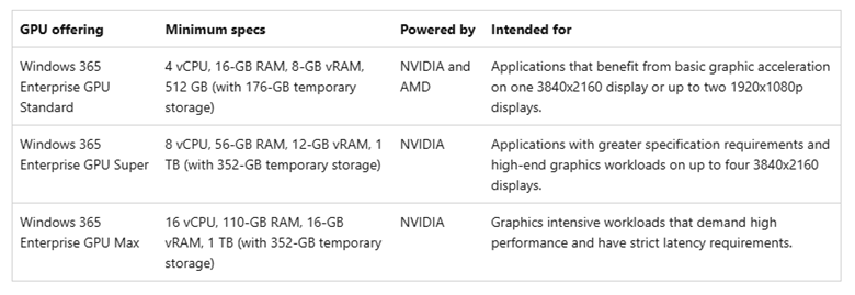 Windows 365 GPU-enabled cloud PCs come in 3 preconfigured options:
