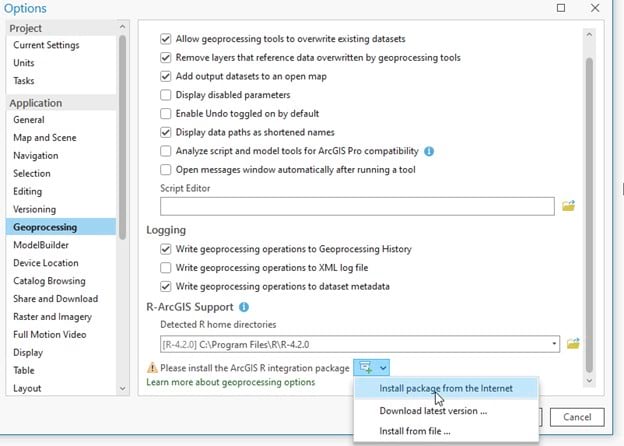 After opening the Pro 3.0 backstage, go to the ‘Settings’ tab on the left hand side. Then choose Options > Geoprocessing. Under the R-ArcGIS Support section, click on the icon and select ‘Install package from the Internet’.