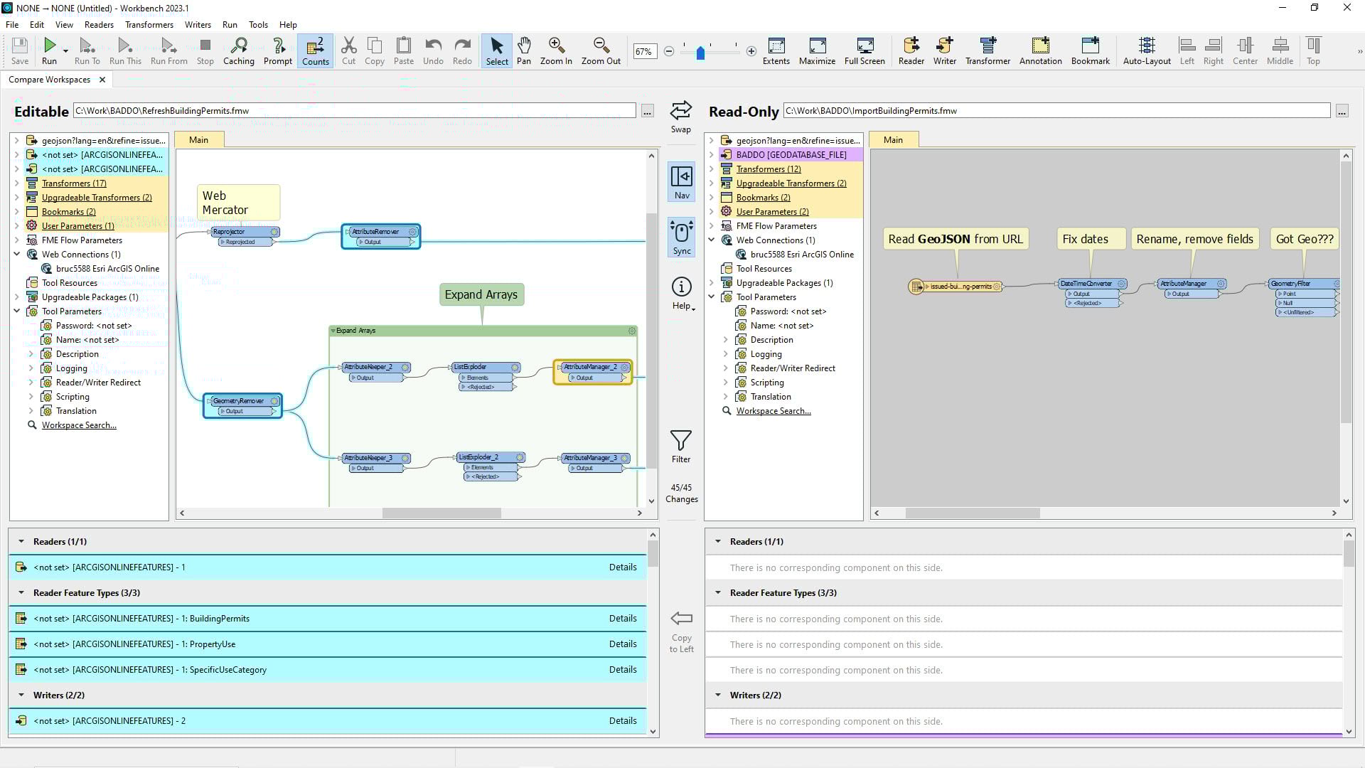 6. Compare Workspaces is a new tool. From Workbench, in the Tools menu, select Compare Workspaces and select your editable and read-only FMW files: