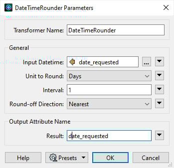 3. DateTimeRounder is new transformer now available. Its need is explained in a few workflows. First, binning data into time intervals, and secondly when doing change detection. The ChangeDetector transformer is brutally strict about comparisons, so when you’re comparing streams from different systems of record, like geodatabase and feature service, and one stores datetimes in milliseconds while the other uses microseconds, then even with identical datetimes you’ll get ‘fake change’ detected, caused by precision, unless you round to a common interval. Here is a simple example of rounding a datetime to the nearest whole day, expressed in ISO format: 2022-01-01T08:00:00 rounds to 2022-01-01T00:00:00 and overwrites the subject fields with these transformer settings: