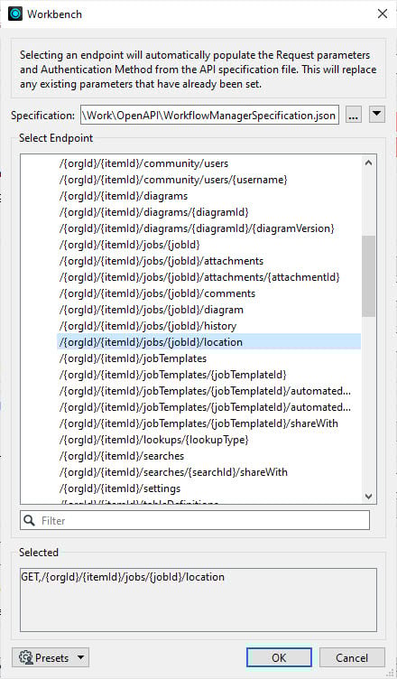 Here is an example using the swagger file for ArcGIS Online Workflow Manager; first import the specification file using the Import button (you need to obtain the file from Esri):