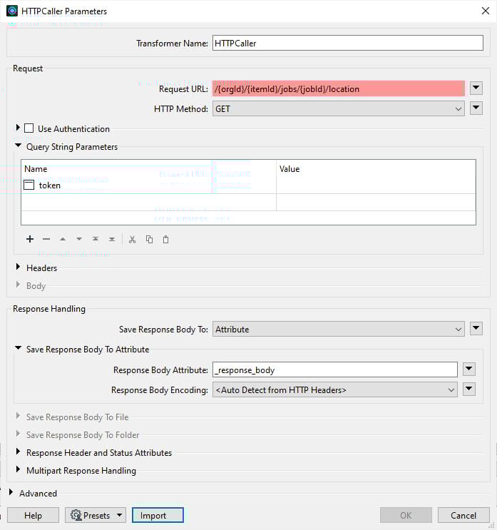 Then the transformer knows I need to supply a token plus URL path values for orgId, itemId and jobId: