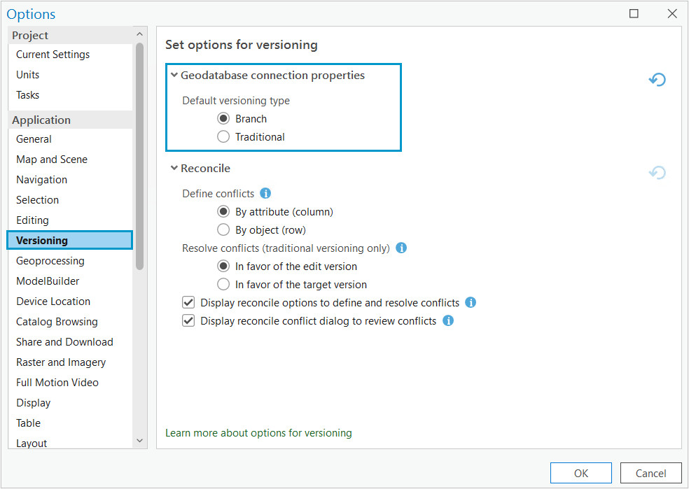 In the backstage on the project Options dialog, we’ve added a new Geodatabase Connection Properties section to the Versioning tab. Here you can set the default versioning type that is used for new database connections.