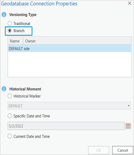When using branch versioning for most workflows, change the default versioning type to branch to simplify the process of creating a new database connection. Afterwards, the versioning type is automatically set to branch for any new connections, thus eliminating the extra step of manually accessing the Geodatabase Connection Properties page for every new database connection you create.