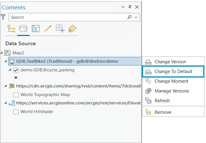 A new option has been added to the Data Source context menu to improve versioning workflows where you are switching between a named version and default.