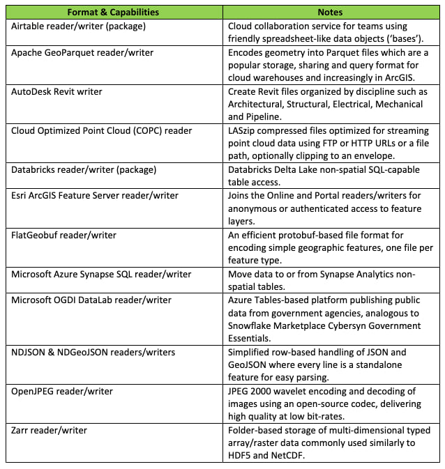 6. Snowflake keeps growing in spatial capability and general popularity; support for Snowflake’s spatial references is now included (not just their original spherical rendition of WGS84). Variant columns containing XML are properly returned with other columns, and if you’re writing spatial data into Snowflake, you can use the first written feature to set the spatial column properties.