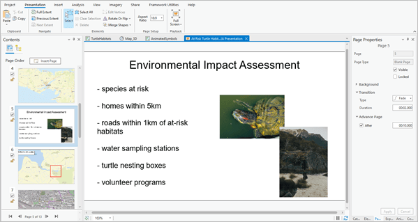 Presentations are a new addition to ArcGIS Pro, allowing you to organize maps, scenes, text, images, and videos into a captivating visual narrative. With Presentations, create a series of pages featuring selected content and explore maps and scenes in full-screen mode. You’re able to set page properties such as transitions, control layer visibility, and even share your presentation with others as PDFs, videos, or collections of images. For example, use this to provide an updated design proposal for a new development or highlight the results of a recent investigation. Get creative when sharing your GIS story using Presentations in ArcGIS Pro.