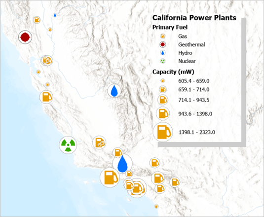 With ArcGIS Pro 3.3, you can classify categorical data with unique values symbology by specifying size or color variables. For example, you can classify point features representing different types of power plants by type and use symbol size to show power capacity. This feature provides a comprehensive view of your data, highlighting variations that would otherwise be missed.