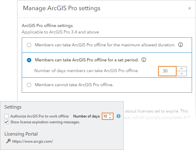 ArcGIS Online administrators now have the ability to control how long ArcGIS Pro licenses can be taken offline. Set a time limit for license checkout, and members can choose how long to take the license offline, up to the administrator’s limit. This feature adds security and flexibility to offline license management.