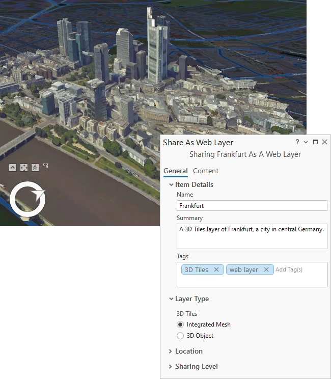 Publish 3D tiles datasets as web layers in ArcGIS Enterprise 11.4. Whether from a scene or a cloud-based dataset, these 3D layers provide large-scale, immersive visualizations, helping you perform more dynamic analysis and better decision-making in web scenes.