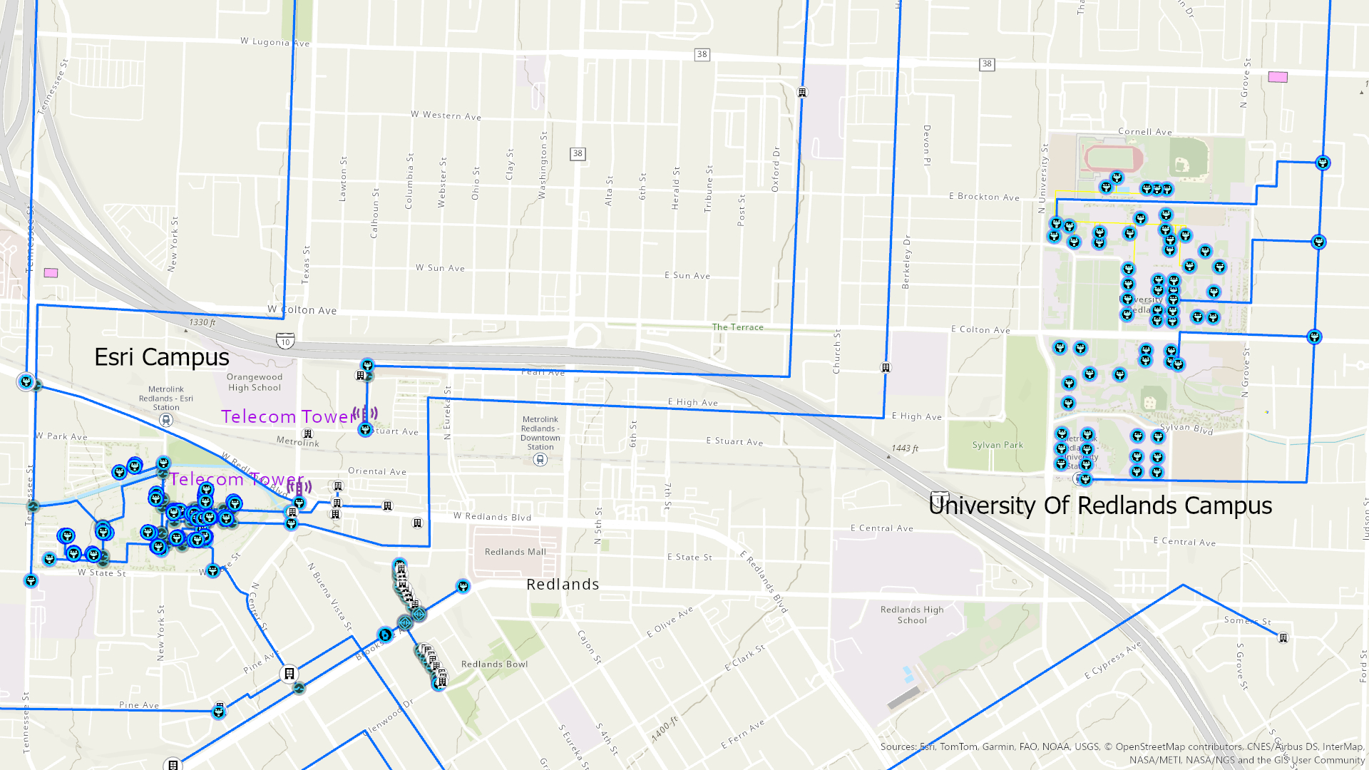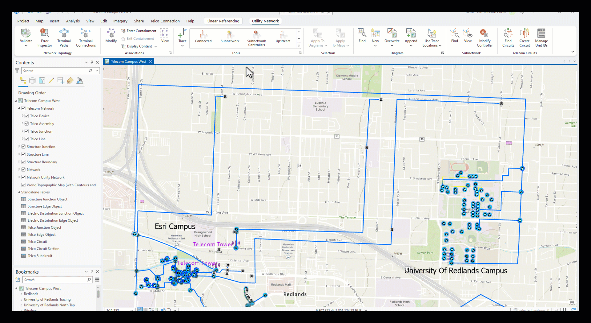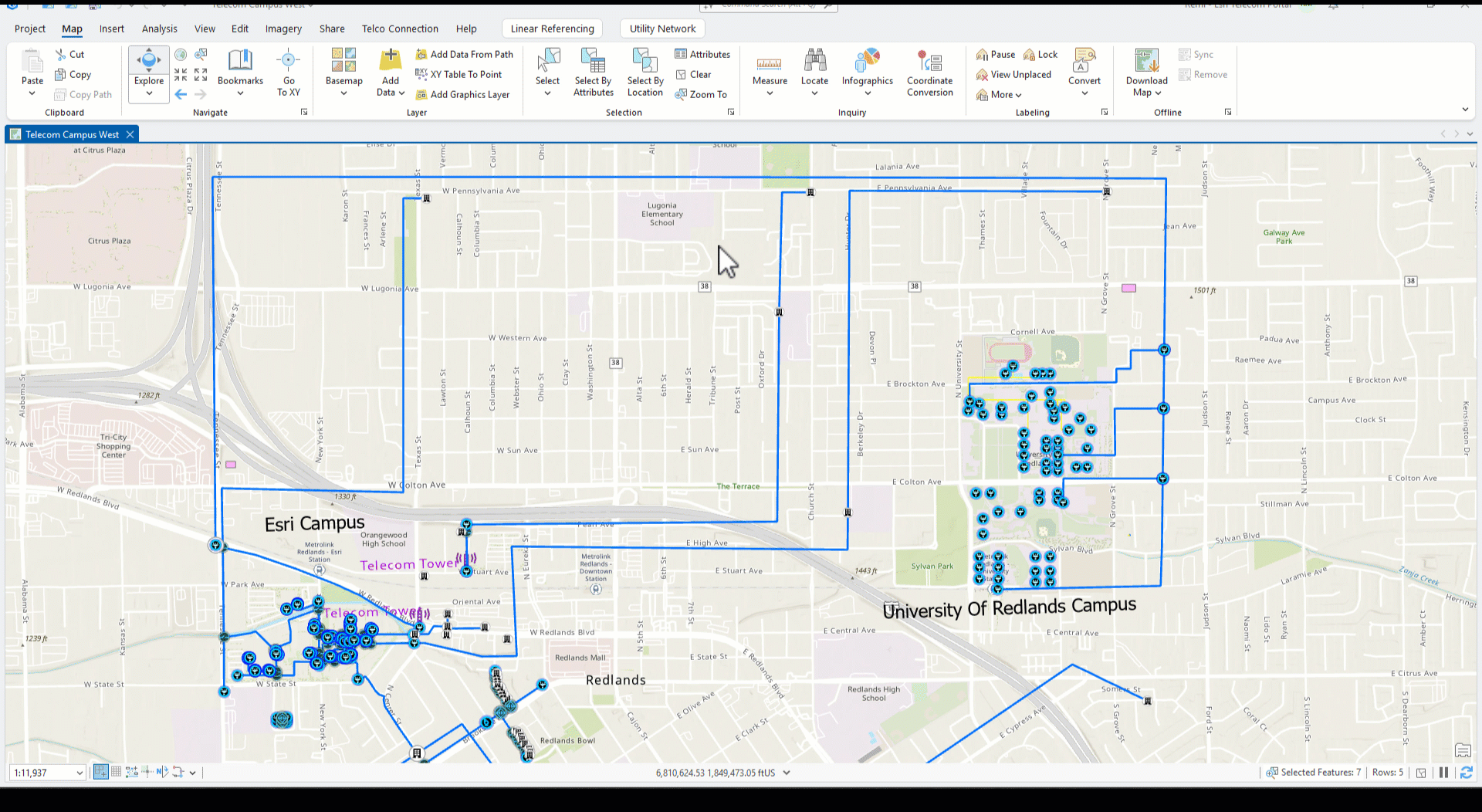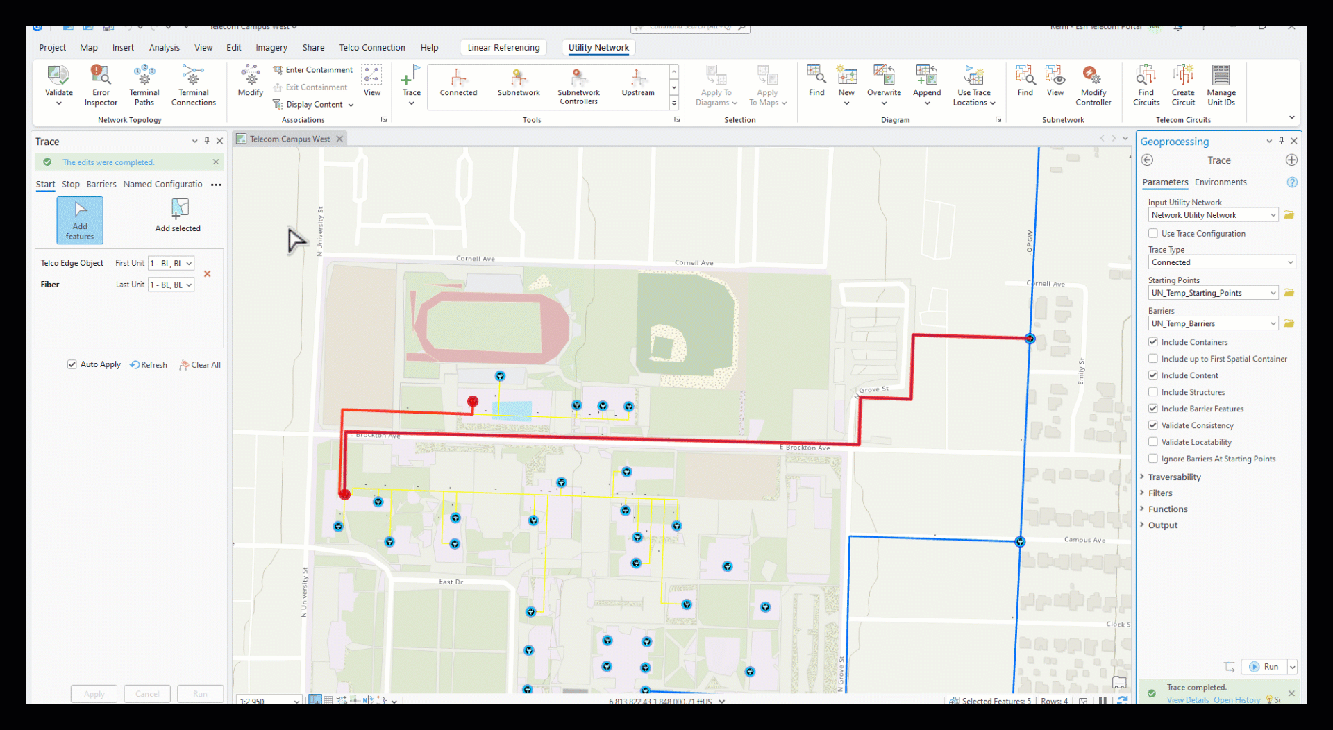 We have identified a bunch of cable running through the University of Redlands campus (Image 5). We are using this cable to select only the attributes for the bundle inside. Although the cable selection has now cleared on our map, we know our fiber is still selected because it is the remaining attribute listed. We established a starting point for our trace by loading the selected fiber into the trace window. The first strand is displayed by default. Using the dropdowns, we can execute a trace on any or all strands within this selection. This is important news for utility network users because now we can trace any nonspatial features grouped within an individual fiber or port.